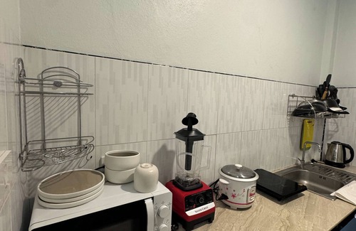 The kitchen is fully equipped for easy cooking. You'll find everything you need, including a blender, microwave, ricecooker, and all the equipment to prepare your meals effortlessly.