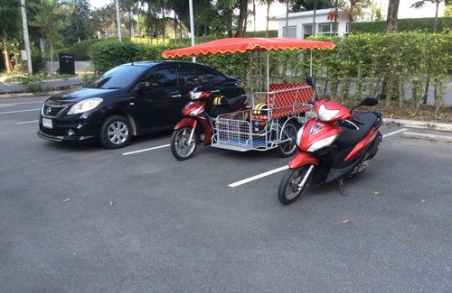 We have a car a motorbike, and a motorbike with sidecar (samlor ) or a bicycle which can be rented only by our Phuphatara guests for good prices and are all in excellent condition.