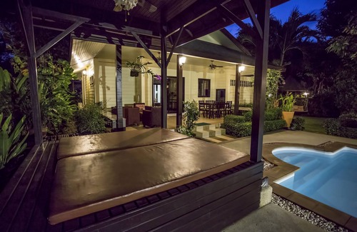 It is an unusual property as it consists of a group of separate Thai style bungalows, built originally for the owner's large visiting family and friends. There is a main home, and smaller bungalows built around two swimming pools and waterfall features . There are abundant balcony's and verandas for entertainment and dinning, including a massage pavilion, Koi Carp pool and waterfall.