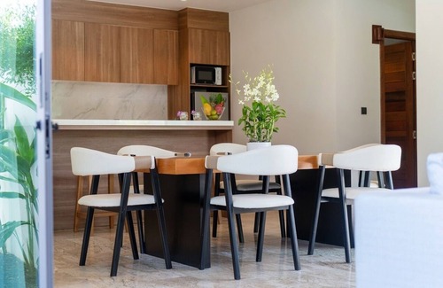 Floor-to-ceiling windows and sliding glass doors give way to lush, tropical garden views at the 3 Bedroom Deluxe Garden Pool Villa at Shamhala Grand Villa. The villa features three bedrooms with ensuite bathrooms with one bathtub in the master bedroom and is a spacious 445m². This is a great villa for a family or a group of friends seeking an idyllic private pool holiday. The functional kitchen allows guests to prepare meals on-site, and the living area has plenty of comfortable seating and a Smart TV. Free WiFi is available throughout the villa, and the private swimming pool is surrounded by a beautiful garden.
