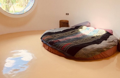 Discover the beauty of this one-of-a-kind, eco-friendly architectural masterpiece. Enter the front dome's Hobbit door and sit on one of the mosaic benches before entering the main room with soaring bamboo roof (9m!). Proceed down arched hallways to the two dome bedrooms with round beds and round mosaic window seats and along another to the bathroom with a huge granite bathtub and a mosaic octopus wrapping its arms around the shower.